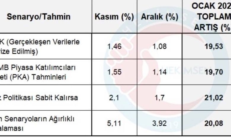2026 OCAK ZAMMI TAHMİN SENARYOLARI Kasım ve Aralık ayı enflasyon senaryolarına göre, OCAK 2026’da maaş artışı %20 civarında .  TÜİK Gerçekleşebilecek Tahminlere Göre: %19,53  TCMB Piyasa Katılımcıları Anketi (PKA) Tahminlere Göre: %19,70  Faiz politikası sabit kalırsa: %21,02  Ağırlıklı ortalama: %20,08  En iyimser senaryoda bile, artış oranı yıl boyunca yaşanan kayıpları telafi etmiyor.  Gerçek enflasyon, maaş artışlarını hâlâ geride bırakıyor.